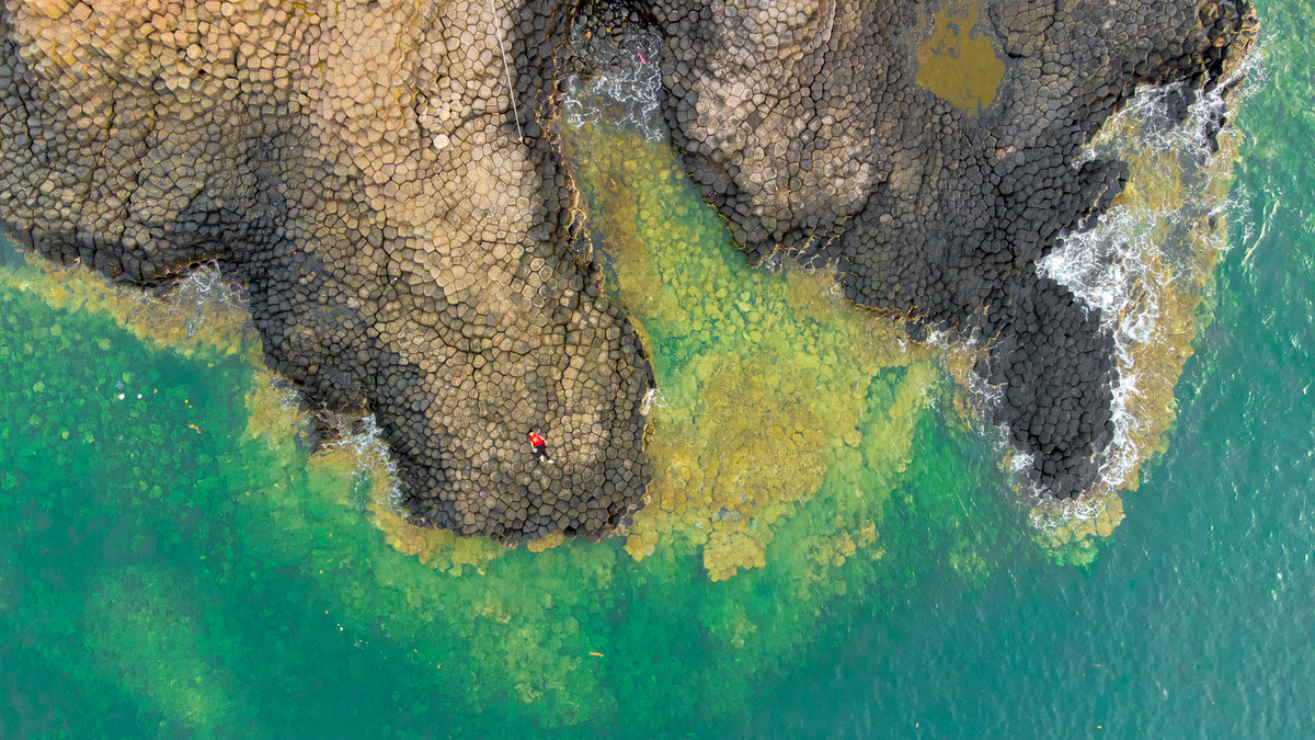 Từ trên cao, có thể nhìn thấy khu gành lấn biển với những khối đá mặt hình lục giác, gắn chặt với nhau tựa miếng sáp ong khổng lồ đều đặn, tạo nên một tổng thể vững chắc với màu đen bóng.