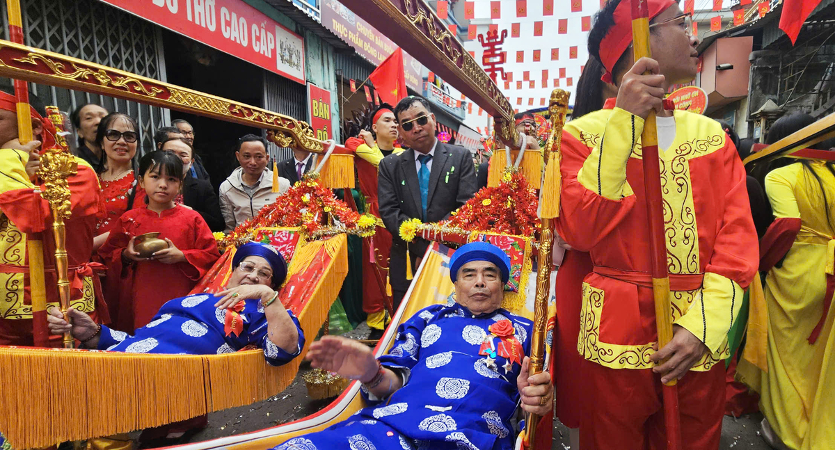 Với những đoàn rước cách xa miếu Tiên Công từ 4-5km, các "cụ Thượng" sẽ được con cháu mời lên xe đẩy được trang trí và có lọng che.