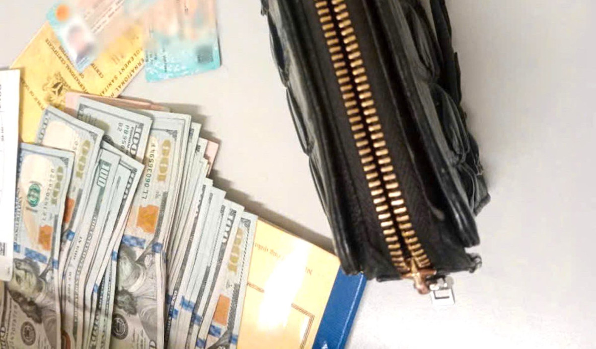 Bên trong chiếc ví có chứa một số lượng lớn tiền mặt là đô la Mỹ và nhân dân tệ có tổng trị giá tương đương khoảng 120 triệu đồng cùng 2 căn cước công dân mang tên N.Q.T. và N.H.T.B.