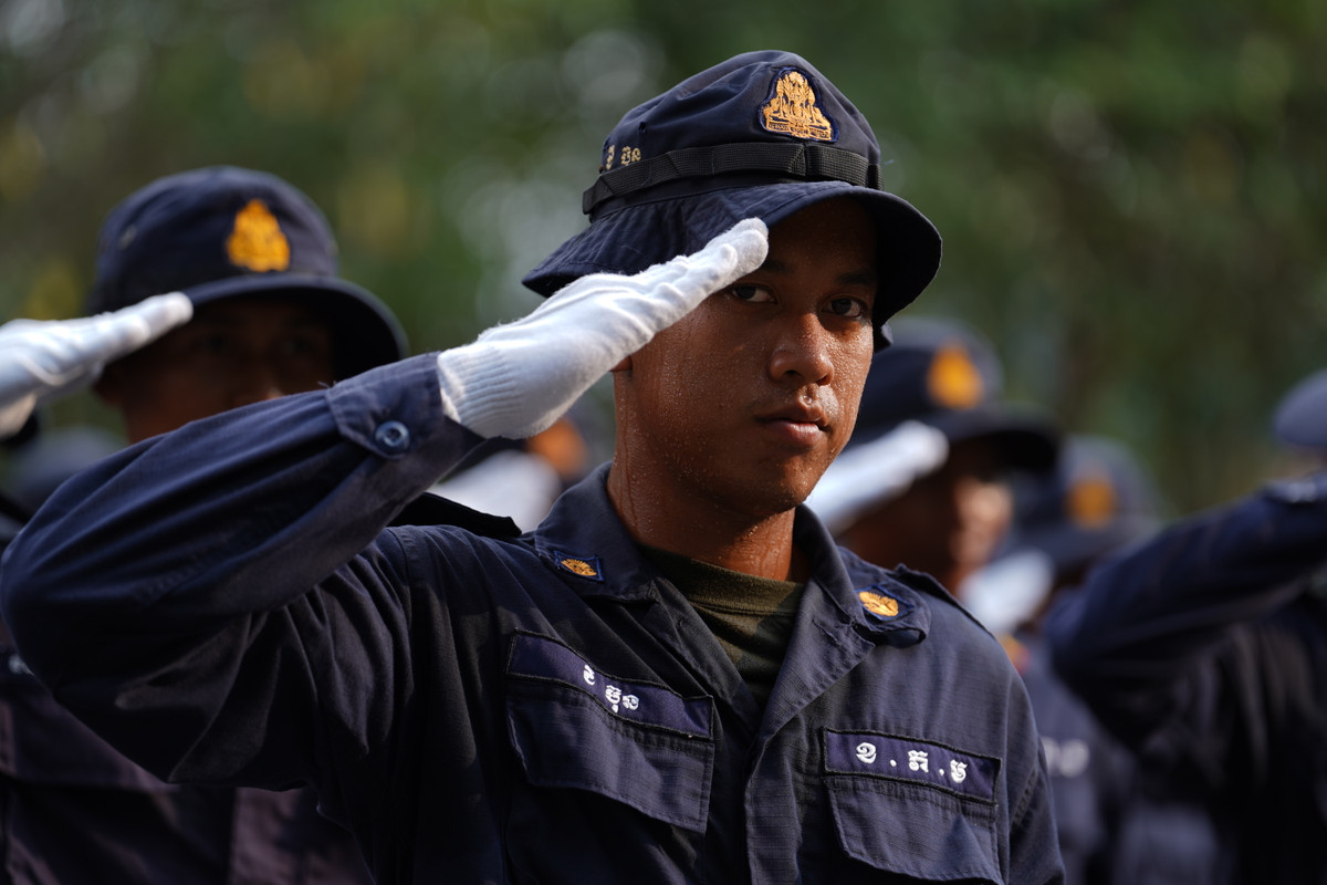 Dẫn đầu khối đội hình là bốn chiến sĩ, trong đó một người cầm quốc kỳ Campuchia, thể hiện tinh thần tự hào dân tộc.