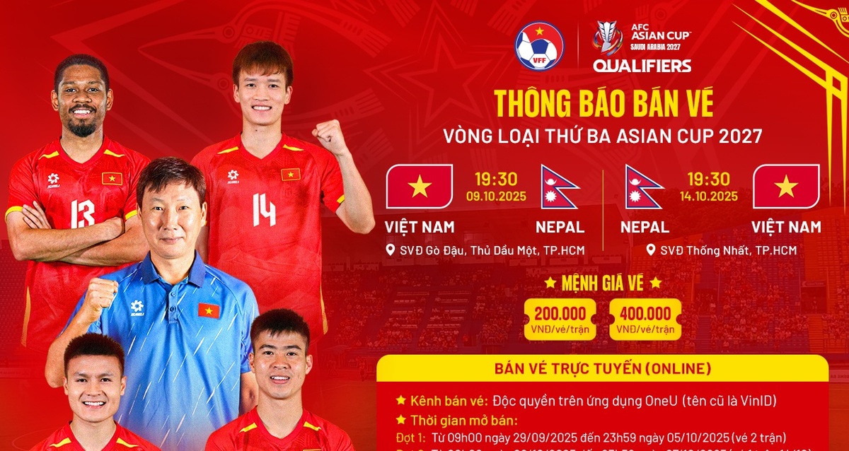Theo đó, ban tổ chức thông báo kế hoạch bán vé các trận đấu giữa đội tuyển Việt Nam vs đội tuyển Nepal tại vòng loại cuối Asian Cup 2027. Vé cả hai trận đấu lượt đi vào ngày 9/10/2025 trên sân Gò Đậu và trận lượt về ngày 14/10/2025 trên sân Thống Nhất đồng loạt được mở bán.