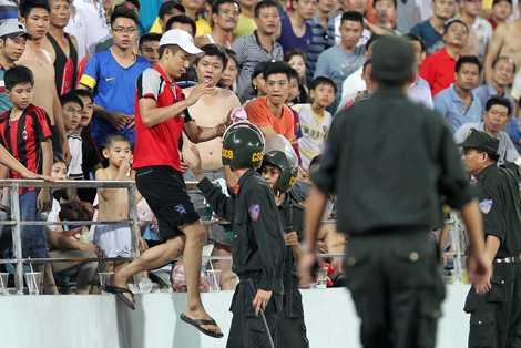 | CĐV quá khích bị lực lượng an ninh dẫn giải ra ngoài (Ảnh: Quang Minh) |