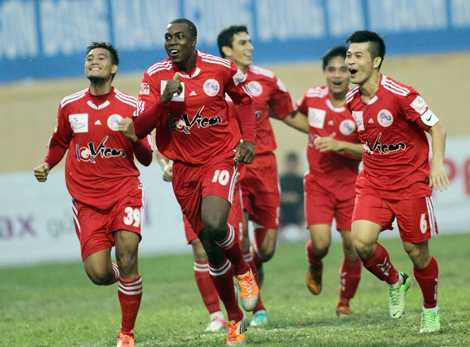 | Cầu thủ V.Hải Phòng ăn mừng bàn thắng trong trận hòa 2-2 trên sân Thanh Hóa (Ảnh: VSI) |