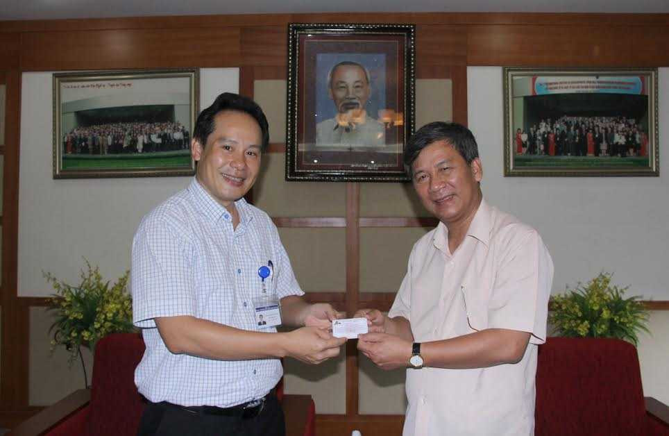 ThS. Nguyễn Hoàng Phúc – Phó giám đốc Trung tâm điều phối quốc gia về ghép bộ phận cơ thể người đã trao Thẻ ghi nhận đăng ký hiến tặng mô, tạng cho GS. TS Nguyễn Anh Trí. - ảnh: Vương Tuấn
