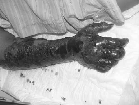 | Tổn thương hoại tử da tay của bệnh nhân bị nhiễm trùng huyết do Aeromonas hydropila. Ảnh: BS Nguyễn Trung Cấp. |