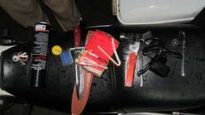 Toàn bộ những hung khí nguy hiểm và dụng cụ để chơi hàng “đập đá” mà Long, Sơn mang theo khi lưu thông (ảnh: N.D)