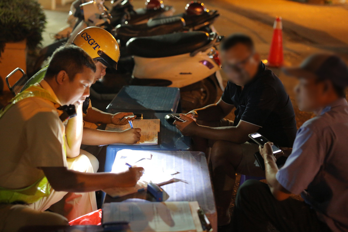Cũng trong đêm, anh P. (SN 1990, quê Nghệ An) lái xe máy với bộ đồ dính đầy xi măng trên đường Kha Vạn Cân cũng bị CSGT dừng xe kiểm tra. Làm việc với CSGT, anh P. bị tổ công tác phát hiện nồng độ cồn mức 0,443mg/lít khí thở, bị lập biên bản xử phạt 7 triệu đồng, tước giấy phép lái xe 23 tháng.