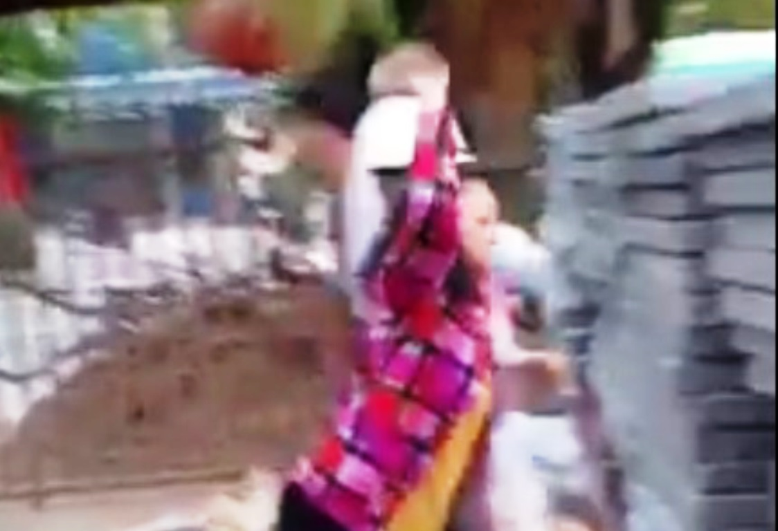 Vợ ông Hướng vác gạch tấn công lực lượng làm nhiệm vụ. (Ảnh: cắt từ clip)