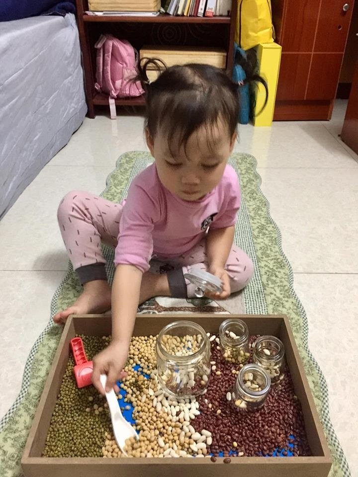 Chẳng hạn như trò chơi nhặt hạt: Mẹ trộn một vài loại hạt dễ nhặt lẫn vào với nhau (hạt đỗ đen, đỗ đỏ, hạt sen…) rồi nhờ bé giúp mẹ phân loại những hạt đó để nấu một món ăn mà con thích như chè chẳng hạn.