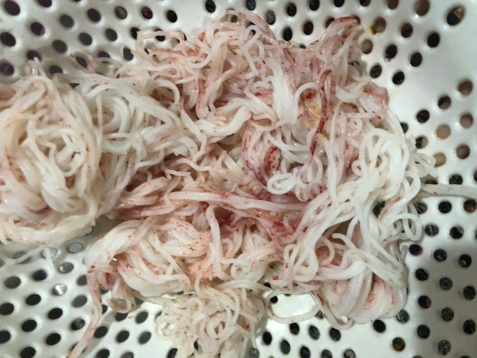 Tuy nhiên, đến khoảng 21h cùng ngày, khi bà lấy ra cho con ăn thì phát hiện nhiều sợi bún đã chuyển sang màu đỏ, mềm và hơi ướt. Đến sáng 7/7, toàn bộ phần bún còn lại đều đổi màu và khi bỏ vào nước lọc thì nước cũng chuyển sang màu đỏ.