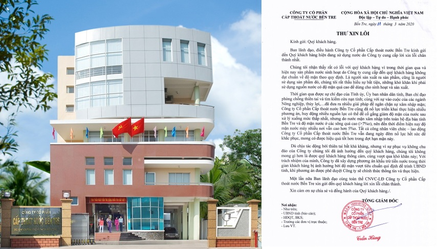“Dù chịu tác động bởi thiên tai bất khả kháng, nhưng vì sự phục vụ không chu đáo của Công ty chúng tôi đã ảnh hưởng đến quý khách hàng, chúng tôi không mong gì hơn là được quý khách hàng thông cảm, cùng vượt qua khó khăn này. Với trách nhiệm của mình Công ty đã xây dựng phương án khấu trừ tiền nước trong thời gian khách hàng bị ảnh hưởng bởi độ mặn vượt tiêu chuẩn quy định để trình UBND tỉnh. Khi phương án được phê duyệt Công ty sẽ chính thức thông tin và thực hiện”, Thư xin lỗi của Công ty CP cấp thoát nước Bến Tre ghi.