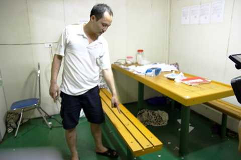 | Anh Trần Quang Vinh chỉ nơi bọn cướp dùng dao chém xuống ghế gỗ nhằm đe dọa, uy hiếp các thuyền viên trên tàu. Ảnh: Phan Cường |