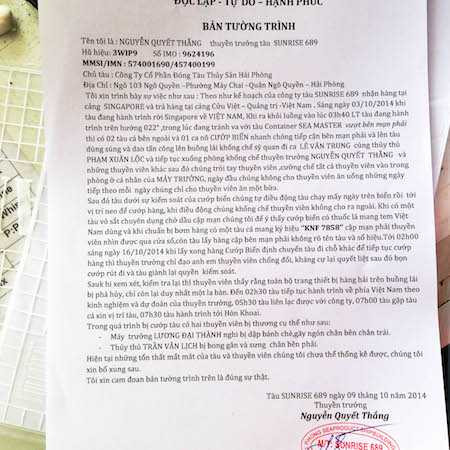 Ngày 9/10, thuyền trưởng Nguyễn Quyết Thắng đã viết bản tường trình về toàn bộ quá trình bị cướp biển khống chế, cướp tài sản, hút dầu trên biển Đông.