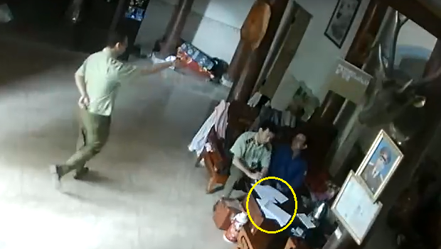 Cán bộ QLTT đến nhà thầy lang mua thuốc nhưng lại đưa giấy tờ ra nói chuyện với thầy lang. (Ảnh cắt từ clip)