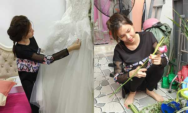 | Kỳ Hân ăn vận giản dị tự tay chuẩn bị hoa cưới. |