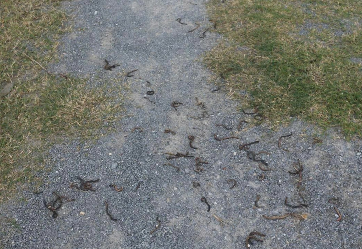 Người dân sống quanh khu vực cho biết, nhiều ngày qua trời không có mưa. Thế nhưng đêm 13/11, giun bắt đầu trồi lên mặt đất, bò cuộn vào nhau thành từng vệt kéo dài trên vỉa hè rồi chết, khiến người dân hoang mang.
