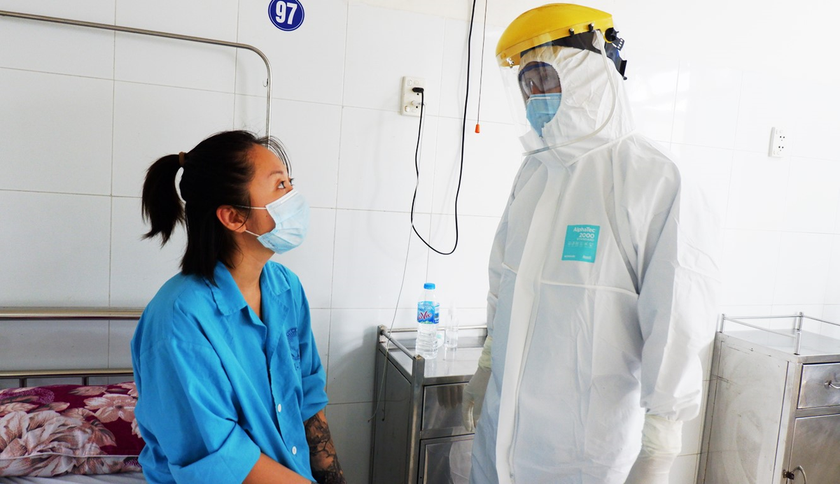 Bác sĩ thăm khám, động viên bệnh nhân COVID-19 điều trị tại Khoa Y học nhiệt đới Bệnh viện Đà Nẵng.
