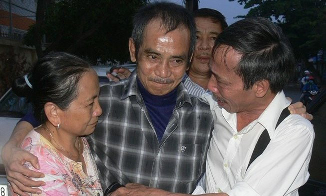 Ông Nén trong vòng tay người thân ngày ông được tư do sau 17 năm ngồi tù. (Ảnh: PHƯƠNG NAM)