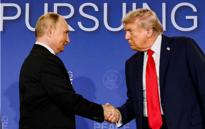 Tổng thống Mỹ Donald Trump và Tổng thống Nga Vladimir Putin bắt tay nhau trong buổi họp báo ở Anchorage, Alaska, Mỹ, ngày 15/8. (Ảnh: Reuters)