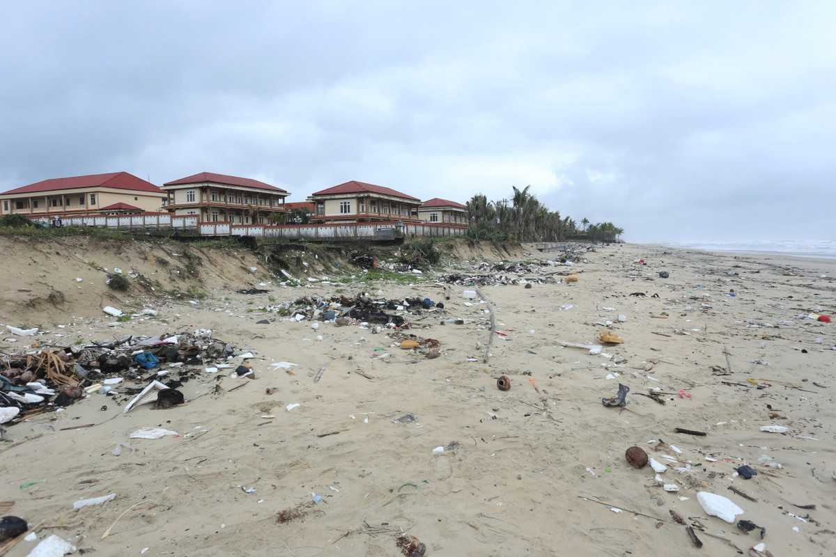 Bờ biển vịnh Lăng Cô đoạn qua dự án khu du lịch nghỉ dưỡng quốc tế Minh Viễn Lăng Cô (thị trấn Lăng Cô) nhếch nhác bởi lượng lớn rác thải, chủ yếu là túi nylon và chai lọ.