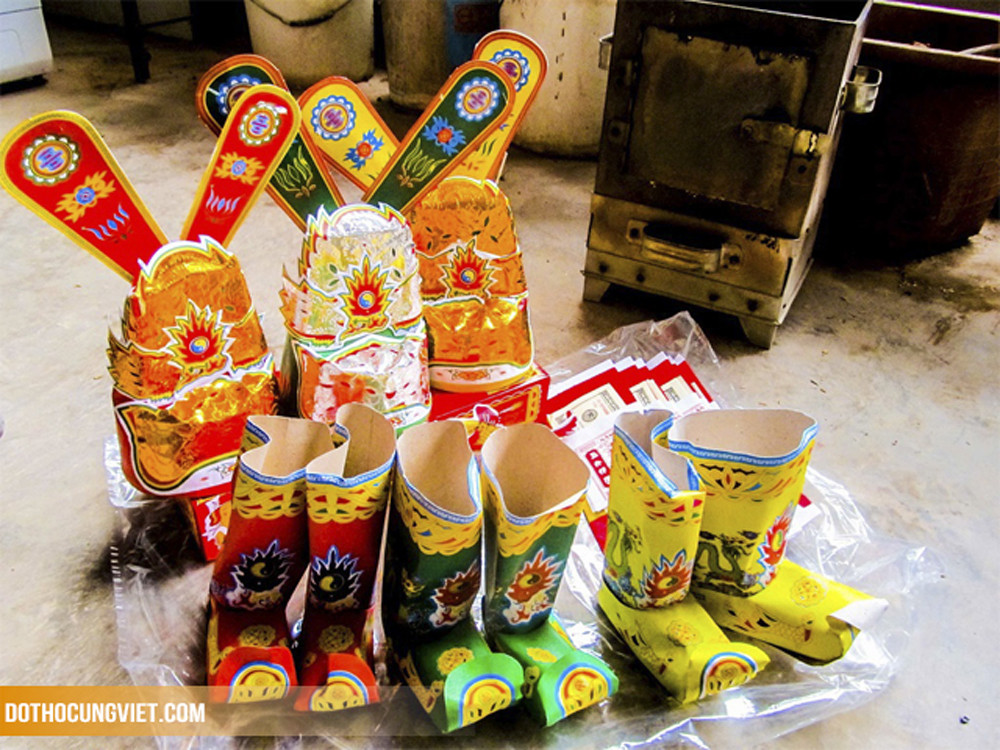 - Bộ mũ áo ông Công ông Táo gồm bộ mũ của hai ông, một bà, thường được làm bằng giấy trang kim màu sắc rực rỡ.