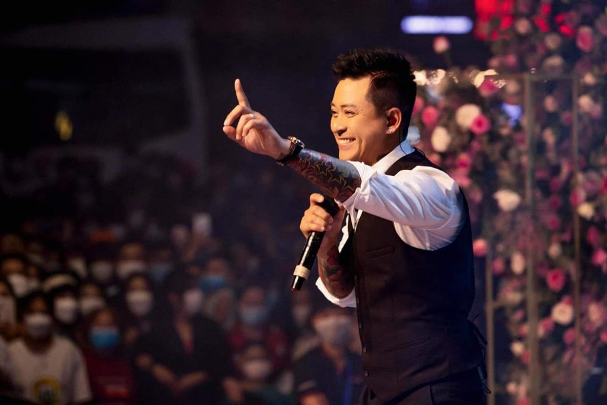 Tuấn Hưng và cử chỉ giơ một ngón tay quen thuộc khi hát trên sân khấu.