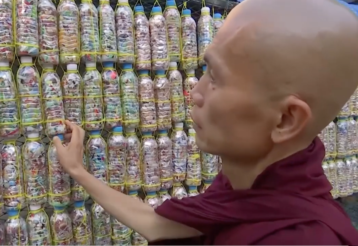 Hoà thượng Ottamasara (Myanmar) mỗi ngày nhận được hàng nghìn chai lọ nhựa đã qua sử dụng để tái chế thành đồ đựng thực phẩm, gạch sinh thái xây dựng thiền viện.