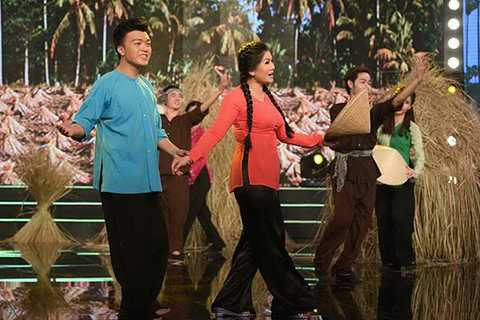 Trong nhạc cảnh "Lúa mùa duyên thắm" mở màn chương trình, Khánh Hoàng chẳng những song ca ngọt ngào, mùi mẫn mà anh còn có màn diễn xuất thật tình tứ bên cạnh đàn chị Tú Sương.