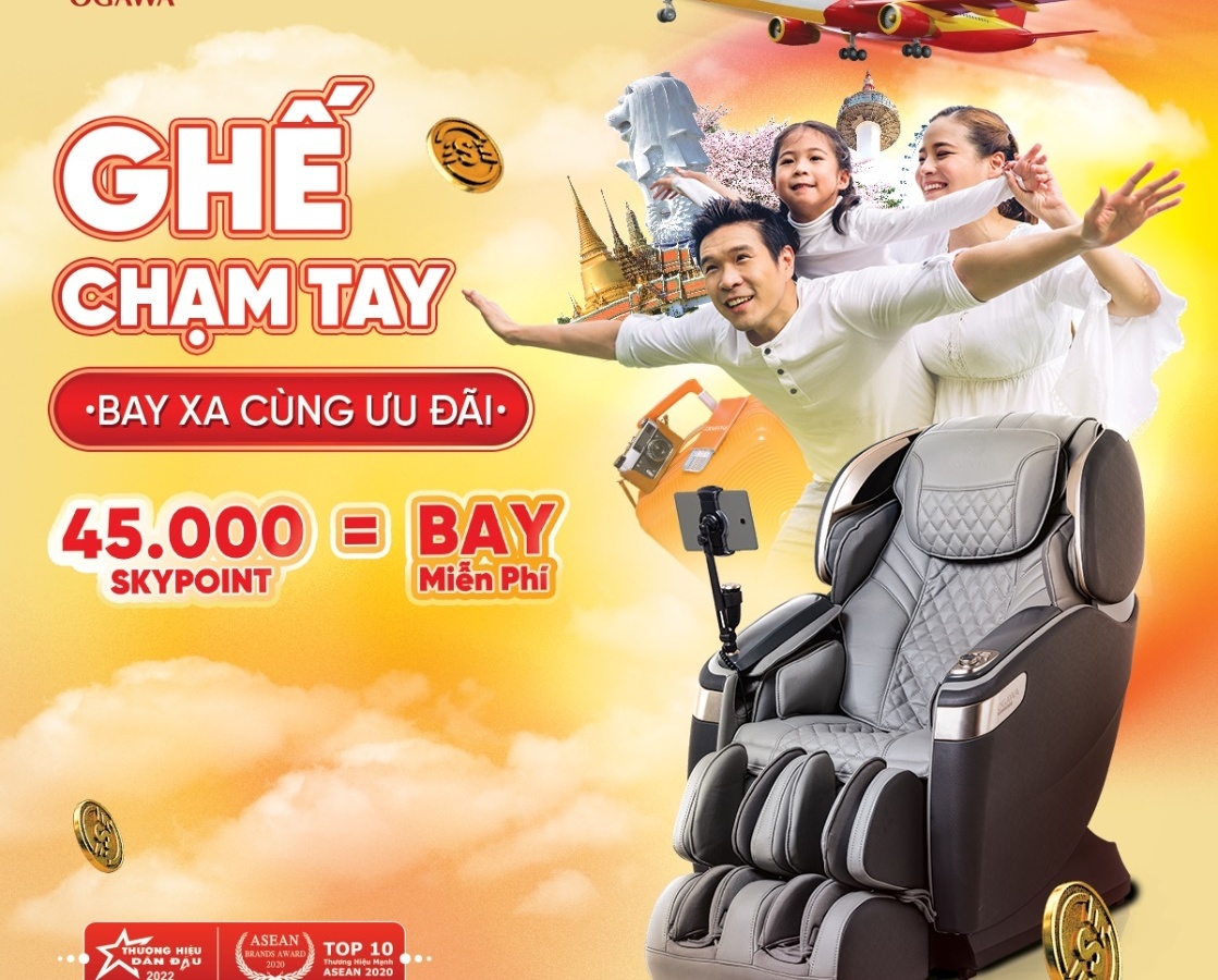 Đây là một chương trình ưu đãi đặc quyền mua sắm nổi bật mà OGAWA đem đến cho khách hàng duy nhất trong tháng 6 này. Cụ thể, khi mua ghế massage OGAWA, các khách hàng sẽ được nhận điểm SkyPoint tối đa lên đến 45.000 điểm trên ứng dụng SkyJoy. Khách hàng có thể dễ dàng đổi điểm thưởng từ OGAWA Vietnam thành vé máy bay của VietJet với mức chi phí 0 đồng.