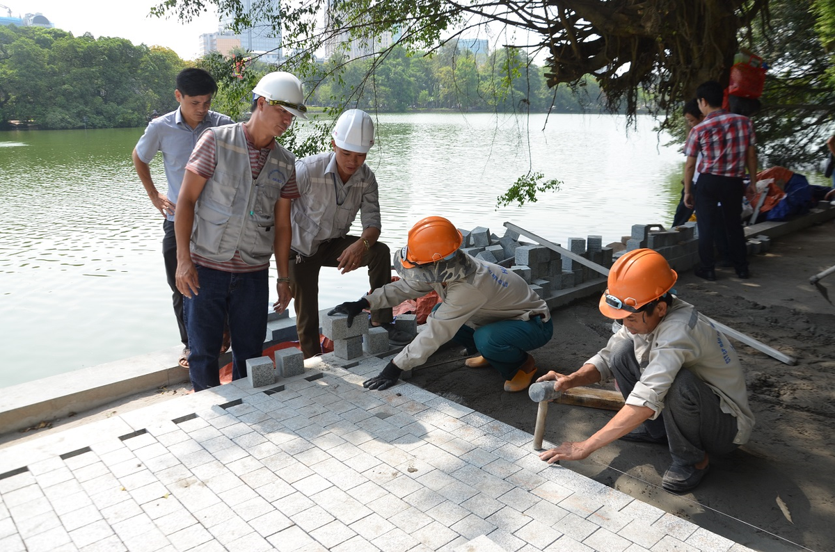 Sau khi thử nghiệm kè 40m bờ Hồ Gươm bằng khối bê tông đúc sẵn, đường dạo, vỉa hè quanh hồ tiếp tục được thay mới bằng đá hoa cương.