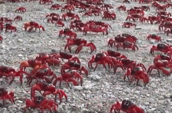 Cuối tháng 10 hàng năm ở đảo Giáng Sinh (Australia), loài cua đỏ đặc hữu bắt đầu di chuyển từ rừng ra biển để giao phối.