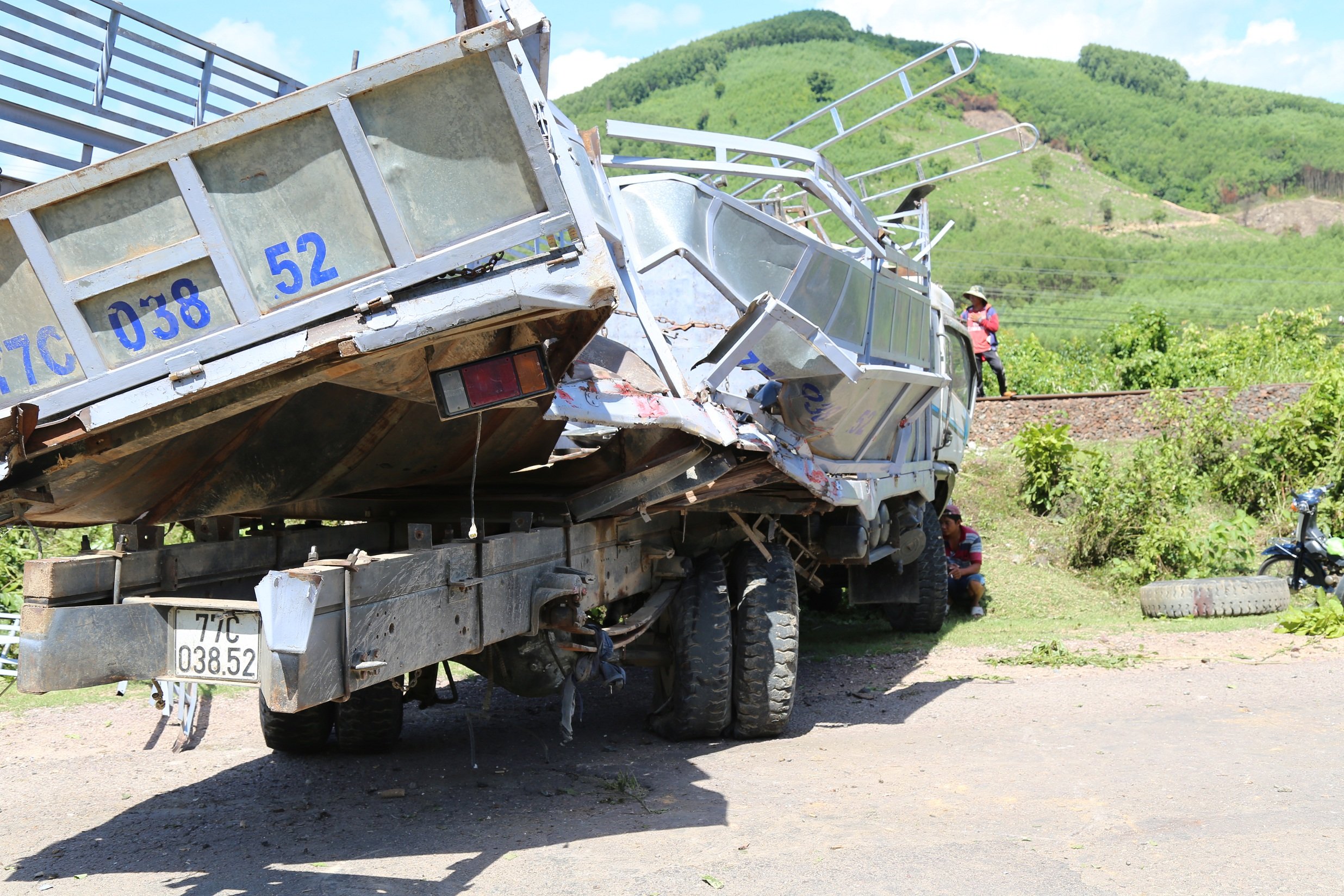 Vào thời điểm trên, xe tải BKS 77C - 038.52 do tài xế Nguyễn Ngọc Tuấn (40 tuổi, ở khối Thịnh Văn 1, thị trấn Vân Canh, huyện Vân Canh) điều khiển băng qua đường ray tàu hỏa. Đúng lúc này, tàu hỏa mang số hiệu SQN4 chạy tới đã đâm vào đuôi xe tải.