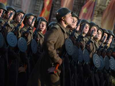 | Quân đội Nga mặc trang phục Hồng quân Liên Xô trong cuộc duyệt binh hôm 7/11 |