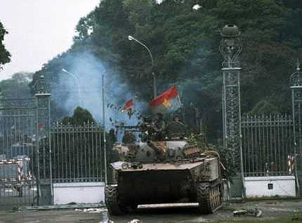 Xe tăng quân giải phóng lao qua cổng dinh Độc Lập ngày 30/4/1975. Chiếc xe tăng 843 bị kẹt ở cổng phụ, chiếc xe tăng số 390 lao qua cổng chính.