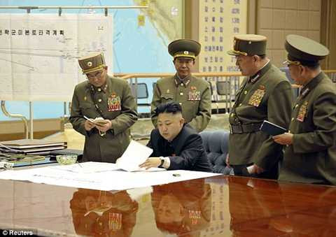 “0 giờ 30 phút sáng 29/3, ông Kim Jong-un triệu tập cuộc họp khẩn, ký quyết định cho lực lượng tên lửa vào vị trí sẵn sàng tấn công Mỹ và các căn cứ ở Thái Bình Dương", theo Dailymail.