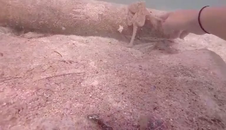 Trong đoạn video, Egbert nhanh chóng nhận thấy không thế tiếp cận con ốc đang ẩn mình dưới khúc gỗ. Ngay khi Elora chìa tay ra, nó bắt lấy ngón tay cô, đặt lên khúc gỡ như để nhờ thợ lặn đẩy giúp vật cản.