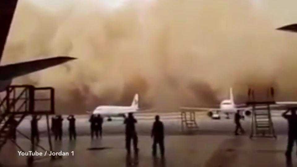 Tại sân bay Queen Alia, Jordan, một cơn bão cát khổng lồ nuốt chửng các máy bay trên đường băng.