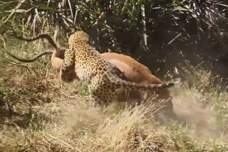 Với tốc độ cùng sự dũng mãnh, báo hoa mai dễ dàng bắt được con linh dương Impala. Sau khi bị tóm, con mồi cố gắng chống trả quyết liệt với hy vọng thoát thân. Thế nhưng, sức mạnh của loài mèo lớn đã khiến linh dương phải bỏ mạng.