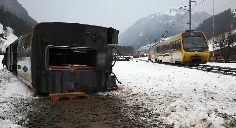 Đoạn video được quay ngày 3/1 tại địa điểm gần làng Lenk, thuộc bang Bern, Thụy Sỹ ghi lại cảnh toa tàu đầu tiên bị trận bão tuyết cực mạnh thổi bay ra khỏi đường ra, song rất may chỉ có vài người bị thương trong vụ việc.