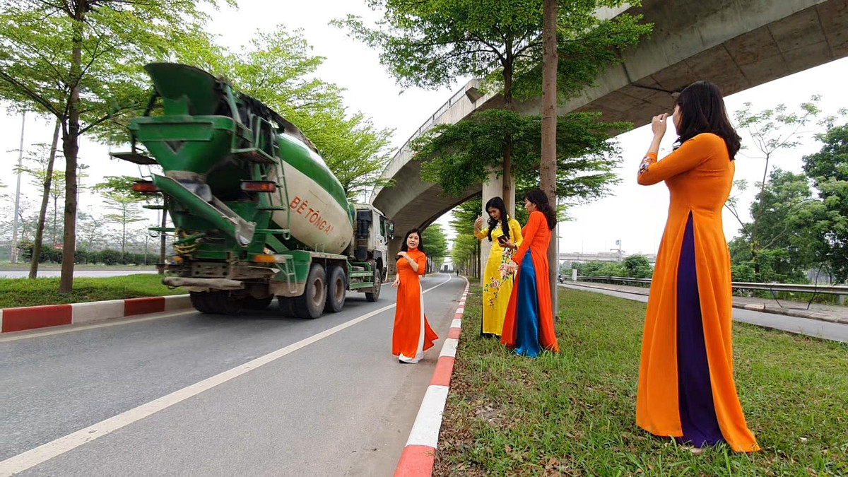 Tại nút giao giữa quốc lộ 5 và cao tốc Hà Nội - Bắc Giang, nhiều người bất chấp nguy hiểm đứng giữa đường để chụp ảnh cùng bàng lá nhỏ.