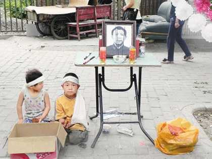 Hai đứa trẻ nhỏ quỳ gối xin người qua đường quyên góp tiền để em lo ma chay cho cha mình, trước mặt em là thùng cát tông đựng tiền, bên trái em là một chiếc bàn có đặt ảnh người cha mới qua đời nhưng chưa được chôn cất. Không ít người động lòng trắc ẩn trước bi cảnh này.