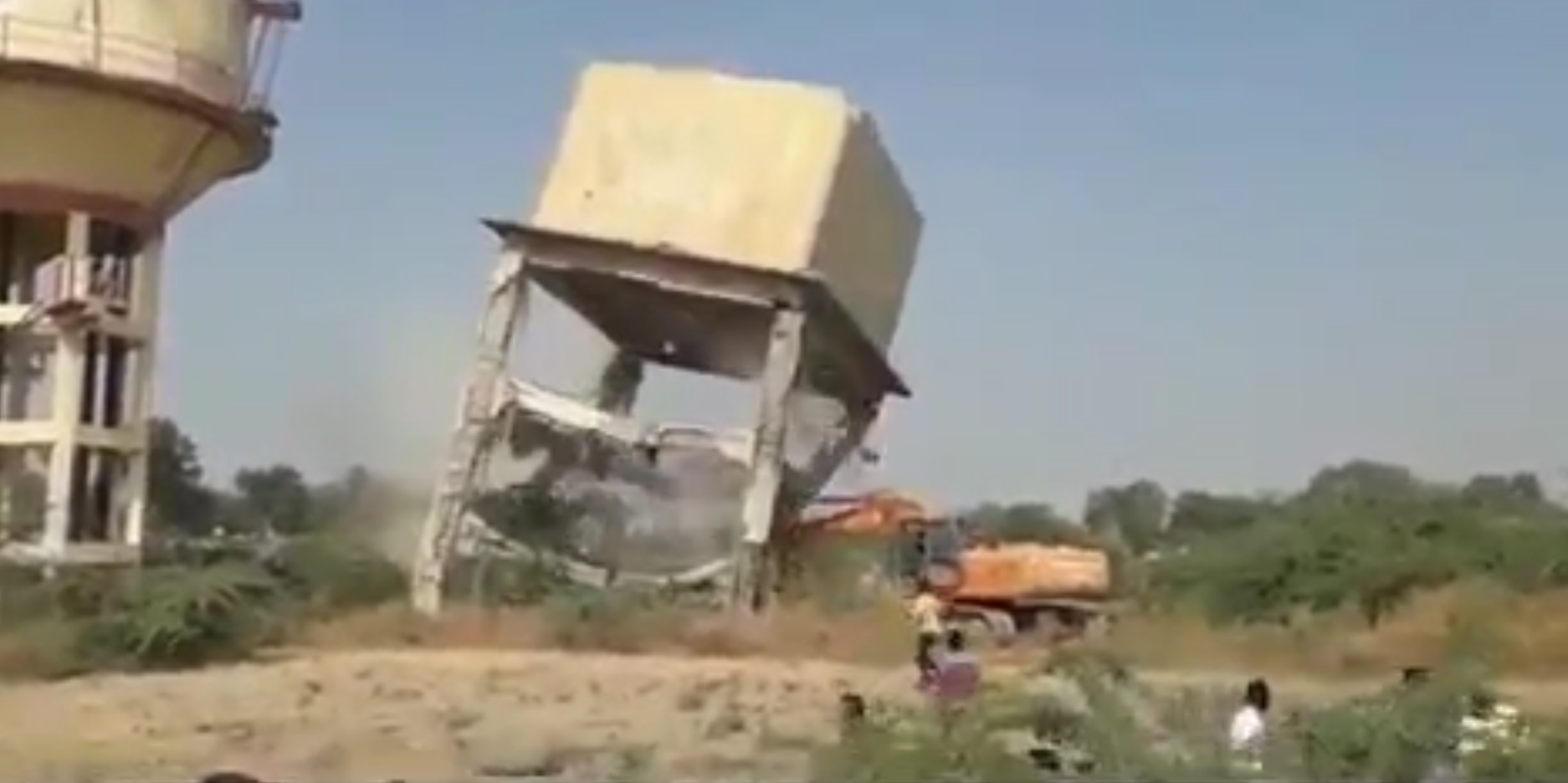 Khi chiếc máy xúc khoan phá chân, bể nước đổ sụp và đè bẹp máy xúc, tuy nhiên người điều khiển chiếc máy xúc may mắn thoát nạn. Vụ việc nói trên xảy ra tại Ấn Độ và đoạn video nhanh chóng được chia sẻ trên mạng xã hội.