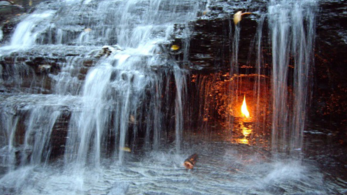 Ở chính giữa thác nước Eternal Flame (Mỹ), có một ngọn lửa nhỏ cháy bập bùng nhờ luồng khí tự nhiên chưa từng bị dập tắt, thu hút khách du lịch khi tới đây.