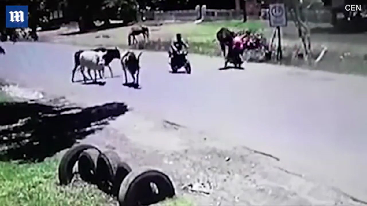 Bị chặn đường, một con bò điên húc văng người phụ nữ đi xe máy trên một con đường tại Capiata, Paraguay.