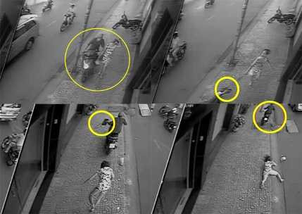| Theo chiều kim đồng hồ: Cảnh chụp lại từ video clip cho thấy tên cướp chạy xe máy từ phía sau trờ tới chị Phượng đang đi bộ, giật túi xách của chị khiến chị lảo đảo và té sấp. Xử lý ảnh và đồ họa: TR.N. |