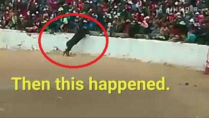 Con bò hung hăng lao lên khán đài khiến đám đông khán giả náo loạn, bỏ chạy trong kinh hãi. Sự cố khiến 4 người bị thương, may mắn thay không ai thiệt mạng.