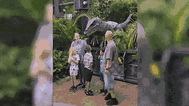 Một gia đình xếp hàng tại công viên Universal Studios (Florida, Mỹ) để chụp hình, chú khủng long robot lén lút tiến gần và phát ra tiếng kêu khiến gia đình hoảng sợ.