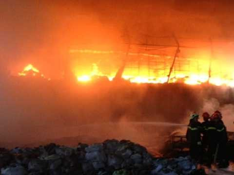 Hàng chục xe cứu hỏa cùng hàng trăm chiến sĩ đang vật lộn với ngọn lửa trong vụ cháy cực lớn tại kho hàng của công ty Duy Hưng trong khu công nghiệp Sóng Thần. Đến khoảng 21 giờ, ngọn lửa bắt đầu được khống chế.