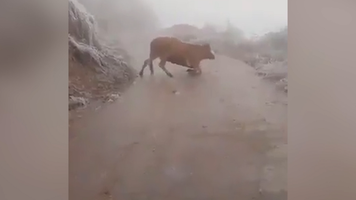 Video: Bò ngã liên tục vì mặt đường đóng băng ở Lào Cai