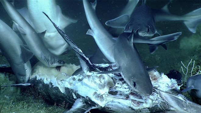 Các nhà nghiên cứu lặn xuống đáy biển chứng kiến kết cục bất ngờ sau khi đàn cá mập ăn thịt con cá kiếm.
